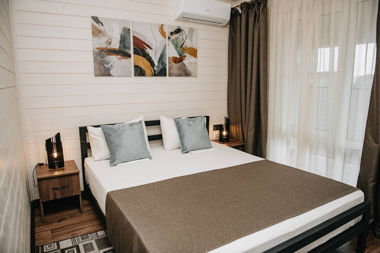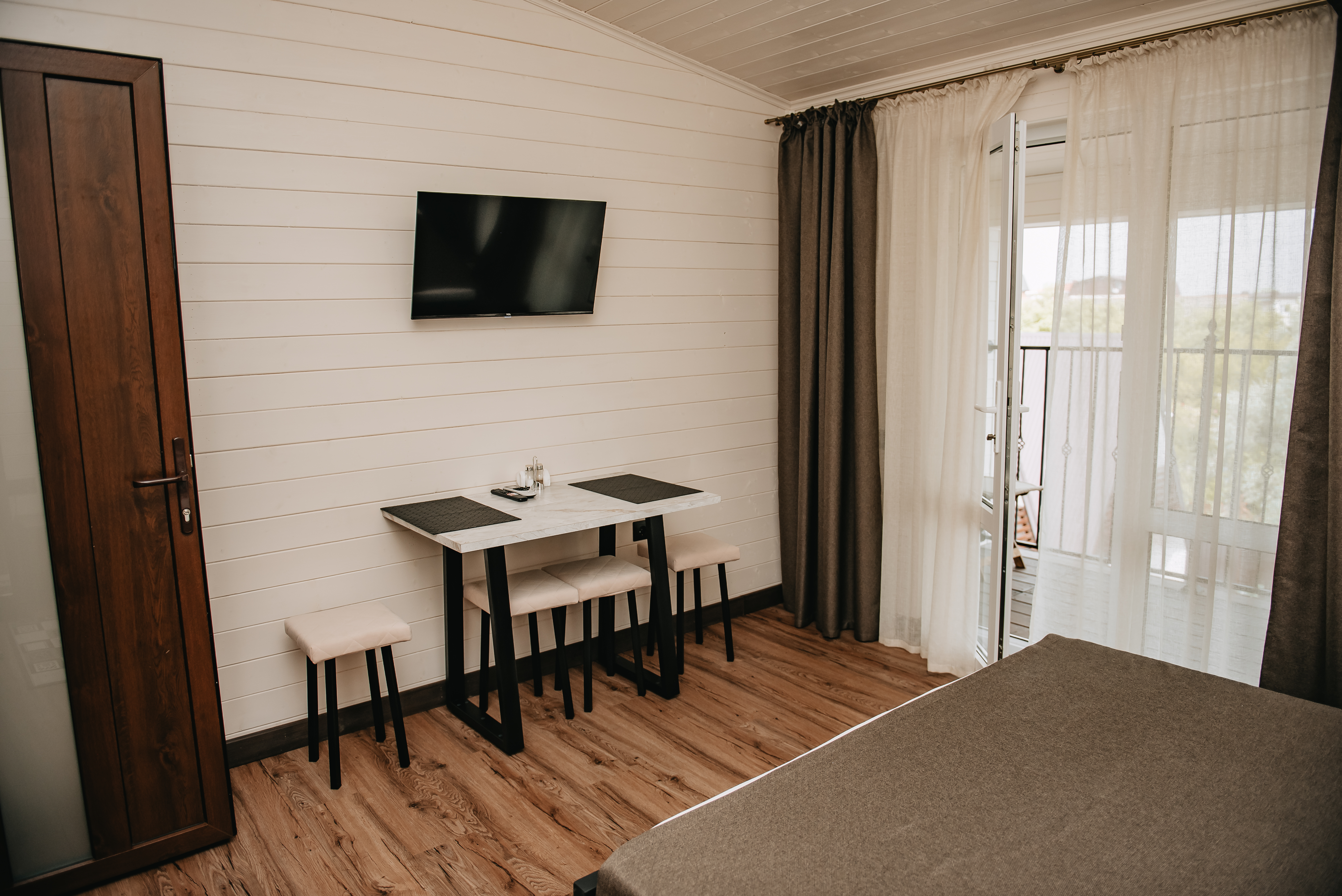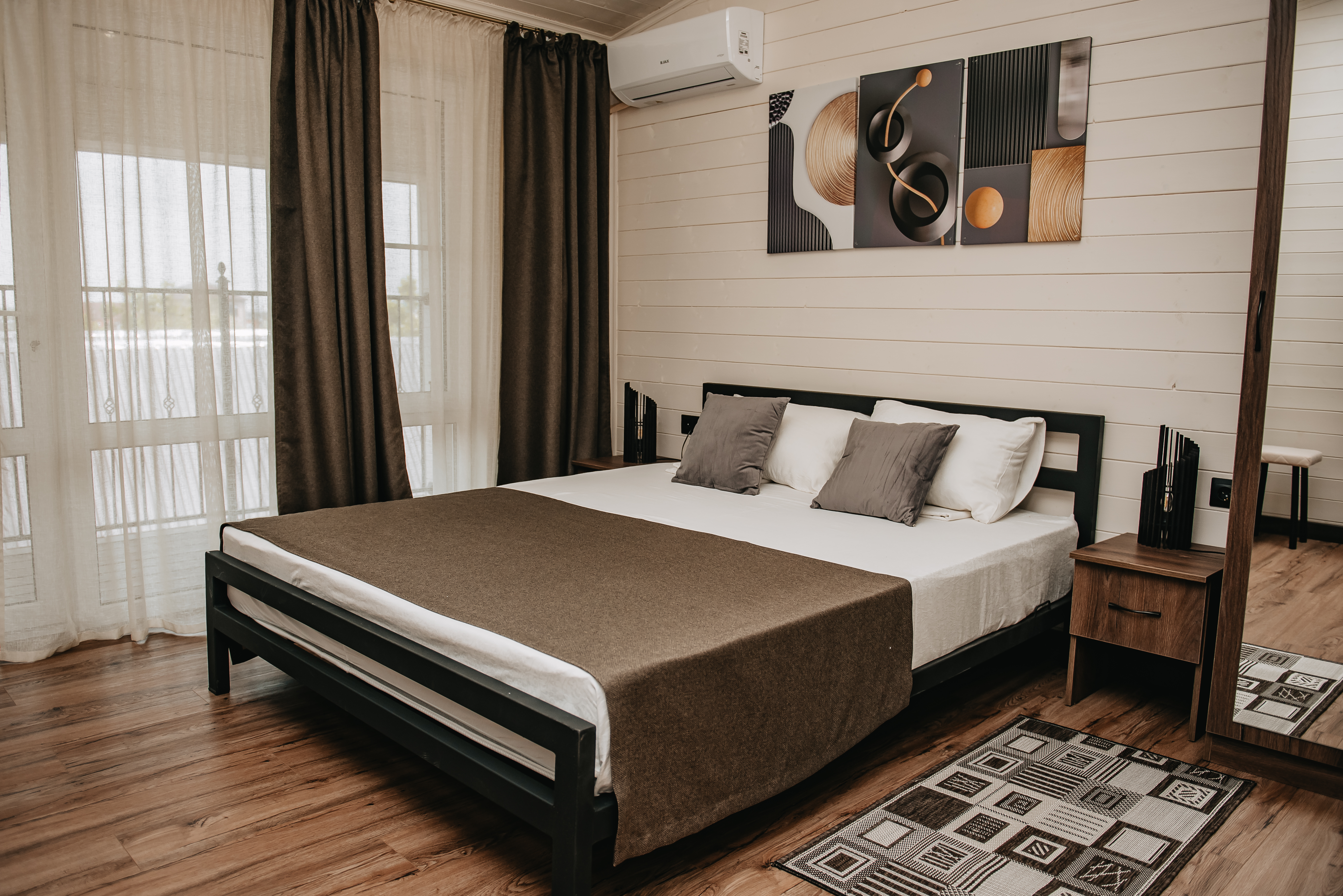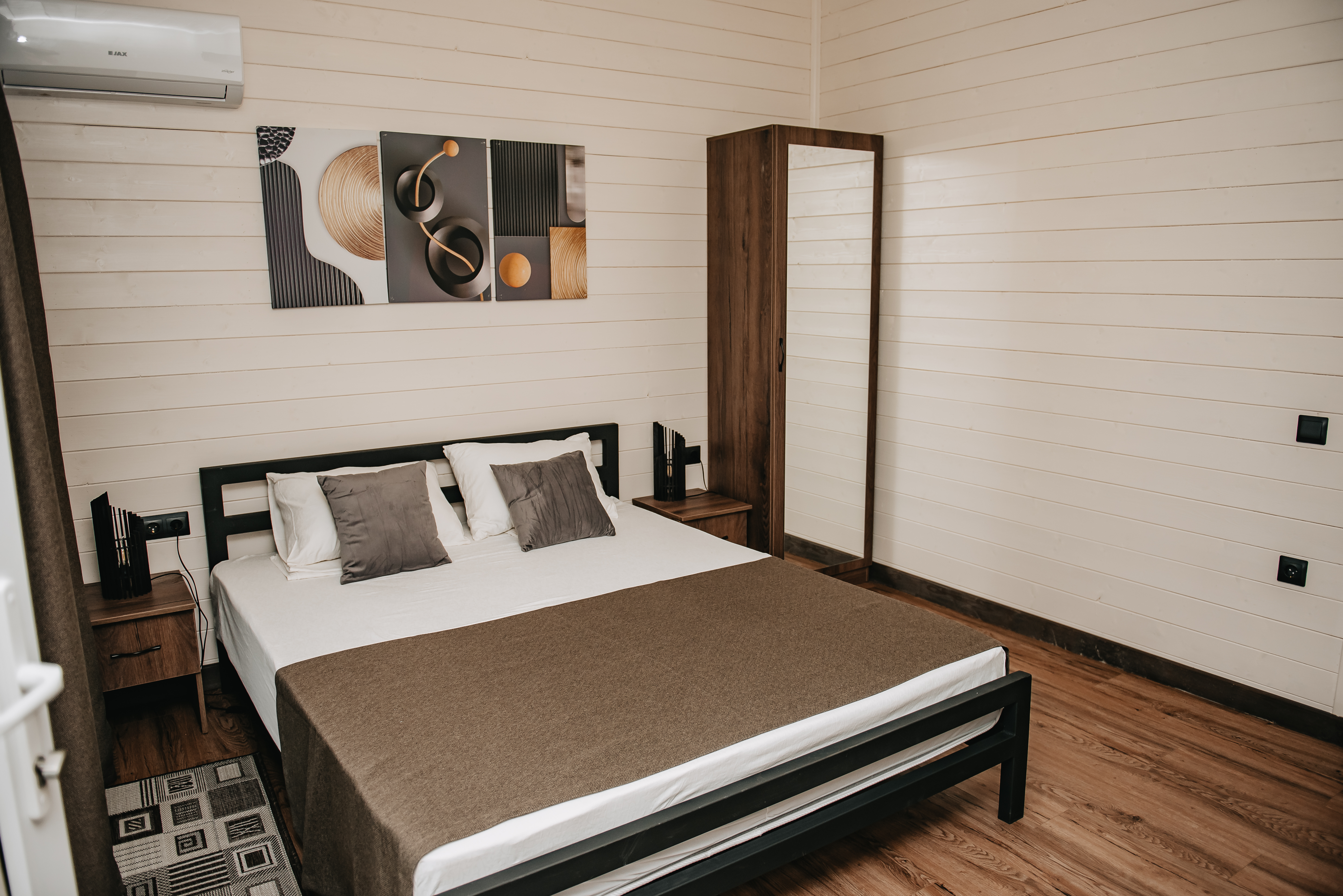 В интерьерах просторных номеров присутствует смешанный стиль Кантри-Лофт. В совокупности, царит атмосфера комфорта, уюта, стиля. Приятный аромат дерева и запах моря позволит Вам отдохнуть и набраться сил и здоровья. Удобные матрасы и подушки, красивое и натуральное постельное белье помогут Вам получить истинное удовольствие